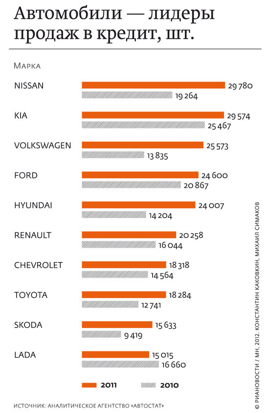 В начале года прогнозы участников рынка относительно темпов развития автокредитования в стране были более чем умеренными, но итоги первого квартала показали, что банкиры недооценили аппетиты потребителей. Грядущую стагнацию рынка эксперты объясняли падением спроса на автомобили и прекращением действия правительственной программы по утилизации машин и субсидированию ставок по автокредитам. В результате рынку был обещан прирост на уровне не более 40–50% в год в денежном выражении. Однако за четыре месяца текущего года кредитов выдано уже на сумму 427 млрд руб., что на 75% больше, чем за аналогичный период прошлого года. «Это весьма солидный объем, учитывая, что в 2010 году объемы автокредитования выросли до 307 млрд руб., а в 2011-м — до 531 млрд руб.», — констатирует аналитик «Инвесткафе» Екатерина Кондрашева. По словам первого зампреда правления Росбанка Игоря Антонова, судя по всему, российский рынок автокредитования в этом году вырастет не хуже, чем в прошлом, когда рост в денежном выражении составил 73%.