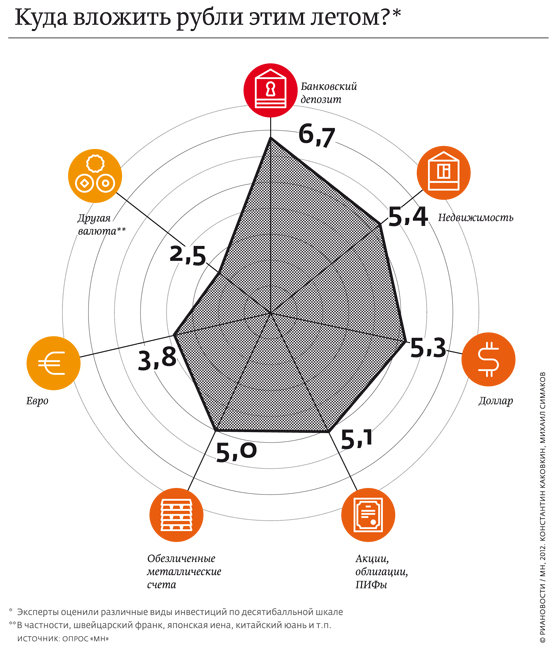 В опросе «МН» приняли участие эксперты из банков UBS, SaxoBank и Номос-банк, управляющих компаний «Альфа-Капитал» и «Финам Менеджмент», инвестиционных компаний «Атон», БКС, «Велес Капитал» и «Уралсиб Кэпитал», инвестиционной фирмы «Олма», брокерской компании Nettrader и инвестбанка «Ренессанс Капитал». Экспертов просили оценить по десятибалльной шкале привлекательность таких видов инвестиций, как банковский депозит, покупка долларов США и евро, других валют, вложений в драгоценные металлы через открытие обезличенных металлических счетов и вложения в российский фондовый рынок. Наряду с этими вариантами экспертам было предложено оценить возможность приобретения недвижимости.