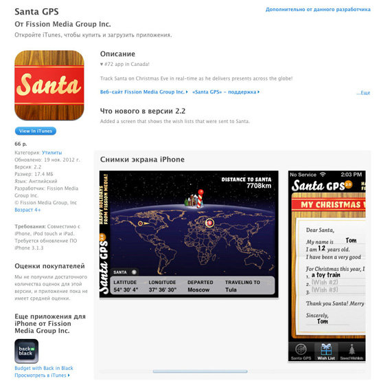 Santa GPS (66руб. – для iPhone) – программа, которая следит за Санта-Клаусом с помощью GPS. Все передвижения Санты отмечаются на карте.