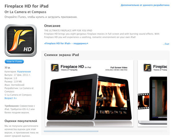 Fireplace HD (33 руб. – для iPad) превращает планшет в виртуальный камин, с которым можно сидеть у елки. Приложение умеет имитировать пламя и потрескивание дров в топке. А если айпад подключить с помощью специального коннектора к телевизору, то камин будет и на большом экране.