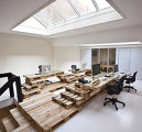 Офис. Дизайнеры оформили с помощью поддонов интерьер рекламного агентства в Амстердаме. Длинный стол в зале для переговоров, лестницы и компьютерные столы — всё сконструировано из ящиков.