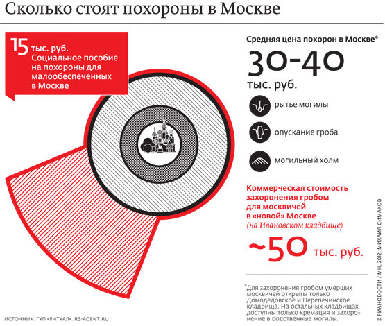 Однако на присоединенных территориях было много самоорганизованных сельских кладбищ, похороны на которых обходились местным жителям гораздо дешевле. «Если жителю деревни надо было похоронить бабушку, он мог заплатить сторожу, и тот ему за 2–3 тыс. руб. помогал вырыть могилу, перенести гроб, — отметил Антон Авдеев. — Теперь все эти кладбища обнесут забором, поставят будки, установят единую цену. В этом смысле похороны для бывших жителей области подорожают». В «Ритуале» также подтвердили, что намерены прекратить практику полулегальных захоронений в «новой Москве».