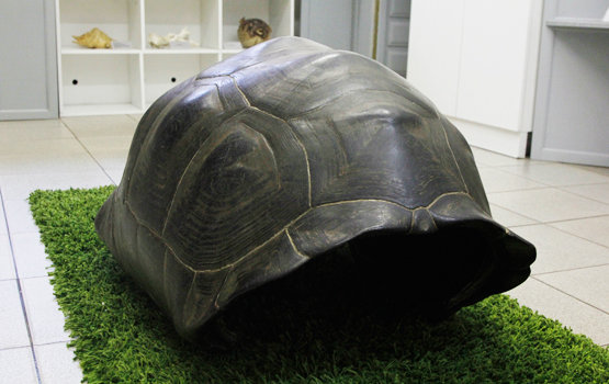 Посреди одного из залов первого этажа лежит панцирь слоновой черепахи. Его можно даже примерить, только детям понадобится помощь взрослых — панцирь очень тяжелый. Живущие на Галапагосских островах слоновые черепахи достигают веса 150–200 кг и живут около 100 лет (до 170 лет — в неволе).