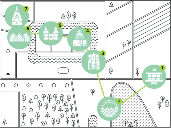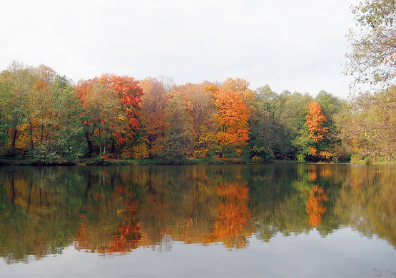 Тропинка извивается среди деревьев и полян, а затем после небольшого моста переходит в более широкую тропу. На ней поверните направо и пройдите по еще одному мосту через речку Серебрянку. После третьего моста сверните налево и идите прямо по берегу пруда, окруженного изящными ивами, так, чтобы вода оставалась слева. Это один более чем из 20 прудов, вырытых вдоль течения рек в лесу по повелению царя Алексея, формировавшего здесь сельскохозяйственную утопию: тут он строил водяные мельницы, дамбы и рыбопитомники.