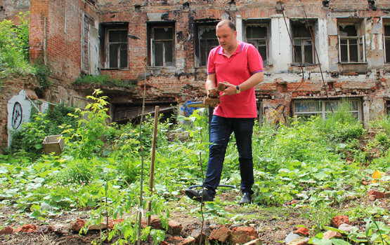 «Здесь у нас орешник, здесь — виноград, здесь вот тыква недавно взошла, тут я картошку посадил», — говорит Пряников, указывая на клумбы, обложенные камнями. На огороде вообще много камней и битого кирпича: все из-за пожара, произошедшего несколько лет назад в ближайшем доме. Здание до сих пор стоит обгоревшее, пешеходный тротуар вдоль улицы огородили. Участок на заднем дворе дома Пряников обнаружил шесть лет назад. За все эти годы на нем ничего не происходило, и в апреле 2012 года Павел решил организовать здесь огород. Его поддержали двое друзей из находящегося неподалеку «ЭкоЛофта» — квартиры, где ставятся эксперименты по экологичной жизни в центре Москвы.