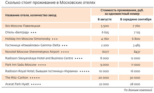Проведенный «МН» экспресс-анализ рынка показал: цены на проживание в середине августа отличаются от сентябрьских на 20–40%. Больше всех готовы идти на уступки гостиницы класса пять звезд. Так, Radisson Royal Hotel (бывшая гостиница «Украина») в августе предлагает клиентам Superior Room за 10 тыс. руб. в сутки. В сентябре за этот же вариант размещения придется отдать уже 16 тыс. руб. То есть скидка на лето составила 40%. В The Ritz-Carlton стоимость проживания в летний месяц и в сентябре отличается на треть — 20 тыс. руб. в августе и 30 тыс. руб. в сентябре.