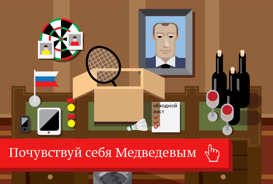 Последний рабочий день все проводят примерно одинаково: складывают накопившиеся за трудовое время вещи, подписывают обходной лист, устраивают отвальную. Как проведет свой последний день в Кремле Дмитрий Медведев, мы не знаем, но представили, что в точности как среднестатистический наемный работник. «МН» устроили президенту отвальную с добрыми словами; сложили в урну все, что ему не захотелось или не удалось сделать; повесили на дартс изображения главных неприятелей главы государства; глядя на портрет Путина, вспомнили о немногочисленных разногласиях в тандеме; положили в коробку фотографии на память; напомнили о подарках, полученных за четыре года, и вписали в обходной лист главные заслуги Дмитрия Медведева.