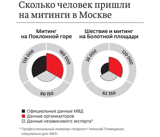 Уличная конкуренция в минувшую субботу наблюдалась во многих российских городах — акциям оппозиции противостояли массовые же манифестации в поддержку власти. Цель митинга на Поклонной горе в Москве идеологически была понятной: показать, что согласных с курсом Владимира Путина больше, чем не согласных. В целом достичь ее удалось. Если верить столичной полиции, пришло более 138 тыс. человек, организаторам — около 100 тыс., инженеру-геодезисту Николаю Помещенко, считавшему количество участников по просьбе «МН», — более 80 тыс. Костяк составили работники бюджетных учреждений и госпредприятий. Посчитать, сколько пришло по своей воле, а сколько — благодаря использованному «административному ресурсу», не сможет, вероятно, никто.