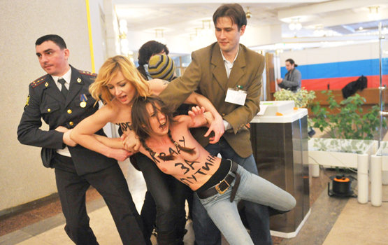 А.Г.: Нас выкрали, чтобы не могли провести свою акцию на Евро-2012. Увезли сначала в парк, потом в милицию. Никто не знал, где мы находимся. Наша активистка, которая атаковала топлесс патриарха Кирилла в защиту Pussy Riot, совсем недавно вышла из тюрьмы. Отсидела с уголовниками 15 суток.