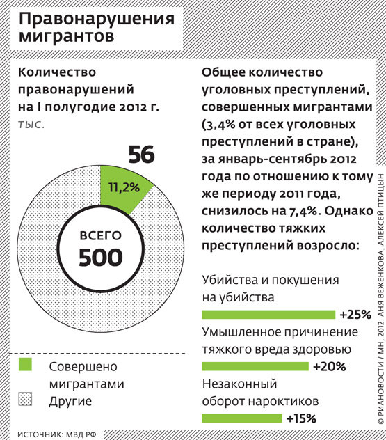 По данным МВД, мигрантами совершается в среднем каждое десятое правонарушение. Разброс — от 3,5% от всего числа преступлений в небольших населенных пунктах до 18% в Москве. Примечательно, что в целом показатели снижаются, но растет число совершенных мигрантами тяжких преступлений, что ведет к еще большему обострению межэтнической напряженности.