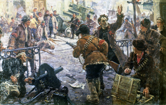 Репродукция картины Г. Савицкого «Бой на Кудринской площади в Москве. Октябрь 1917 года»