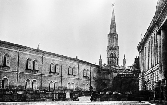 Утро. Продолжается обстрел Кремля большевиками. Одним из снарядов пробиты часы на Спасской башне, другой повредил Арсенал, еще несколько попали в соборы.