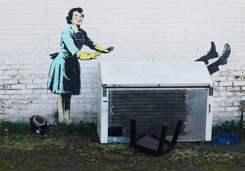 - Перед женщиной Бэнкси положил морозильную камеру, из которой торчат ноги мужчины. Таким образом художник надеется привлечь внимание к проблеме домашнего насилия.
