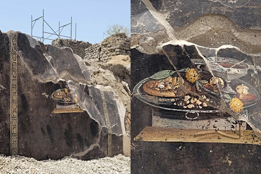 - «То, что изображено на стене древнего дома, могло быть далеким предком современного блюда», — отметили специалисты. На фреске видна лепешка фокачча в форме круга, а также фрукты, вино, финик и похожий на ананас плод.