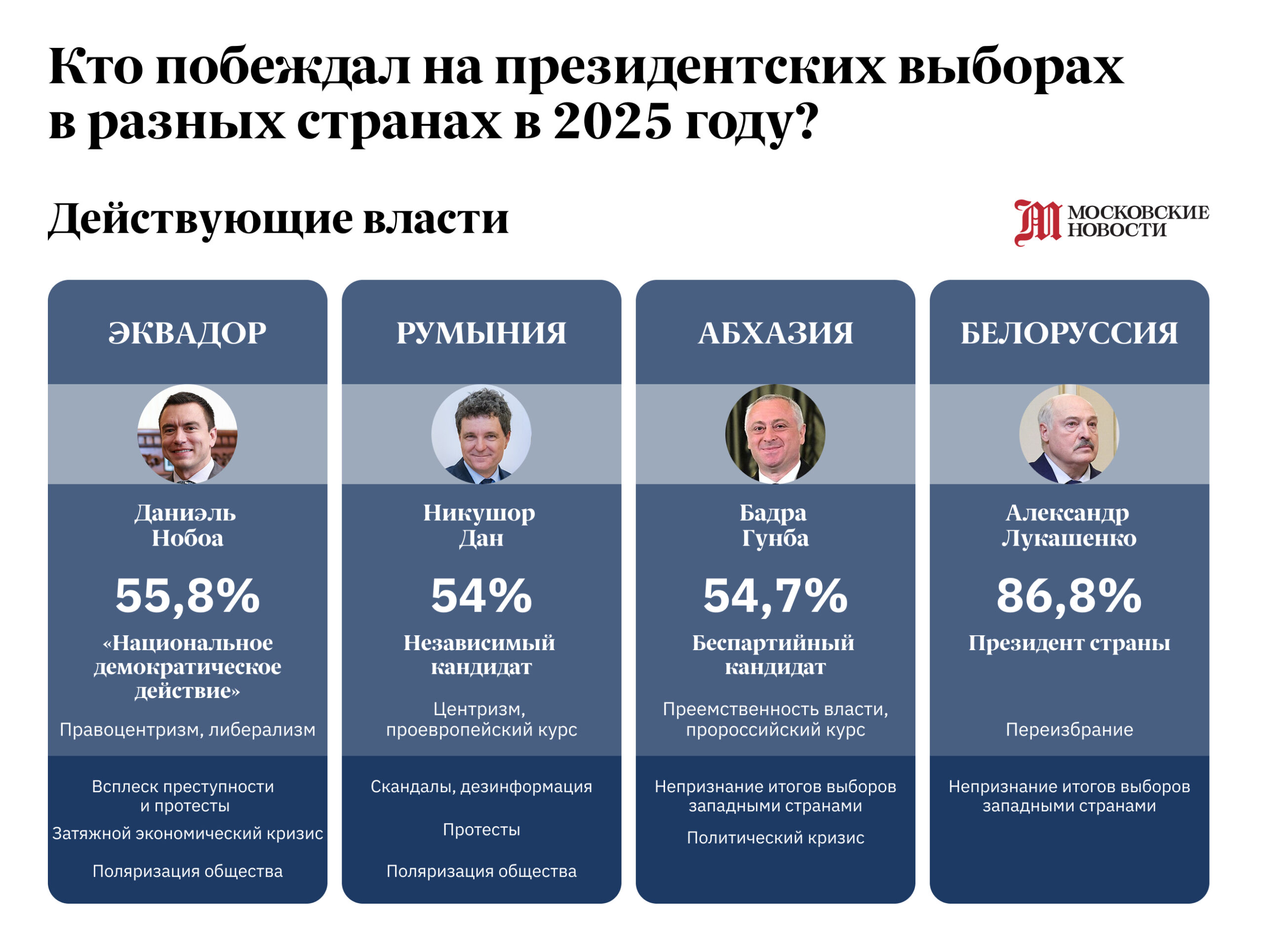 Александр Лукашенко был переизбран на седьмой президентский срок. За действующего главу проголосовали 86,8% белорусов, явка составила более 85%. Из-за результатов прошлых президентских выборов в 2020–2021 годах по стране прокатились масштабные протесты. По официальным данным, тогда Лукашенко набрал больше 80% голосов, в оппозиции результаты сочли сфальсифицированными.