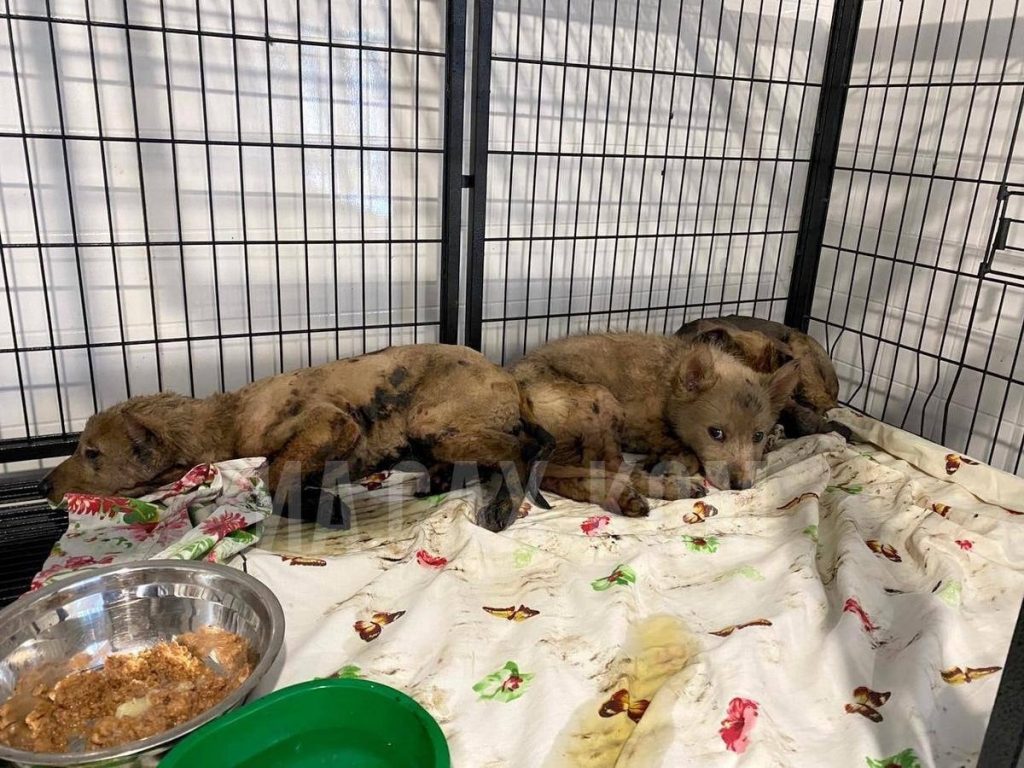 - Животных обнаружили прохожие около заброшенного угольного склада. Ослабшие щенки увязли в луже с битумом и не могли освободиться.