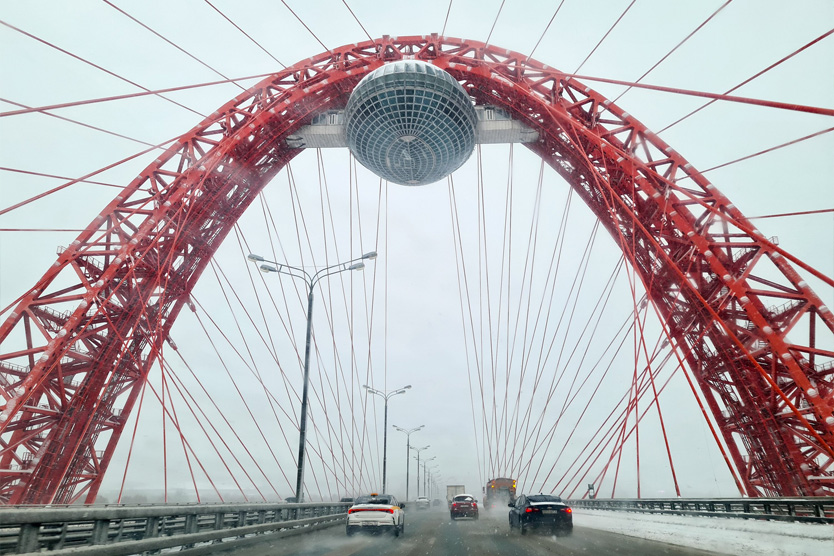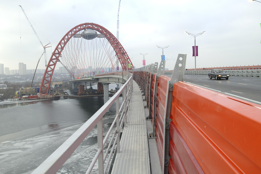 - Во время строительства для монтажа арки применялась уникальная технология: ее собирали на берегу, а затем с помощью плавучих кранов поднимали и разворачивали в проектное положение. Из-за своего цвета и формы мост получил в народе множество прозвищ: «Мост в будущее», «Мост с летающей тарелкой», «Мост с кепкой Лужкова» (во время строительства моста мэром столицы был Юрий Лужков).